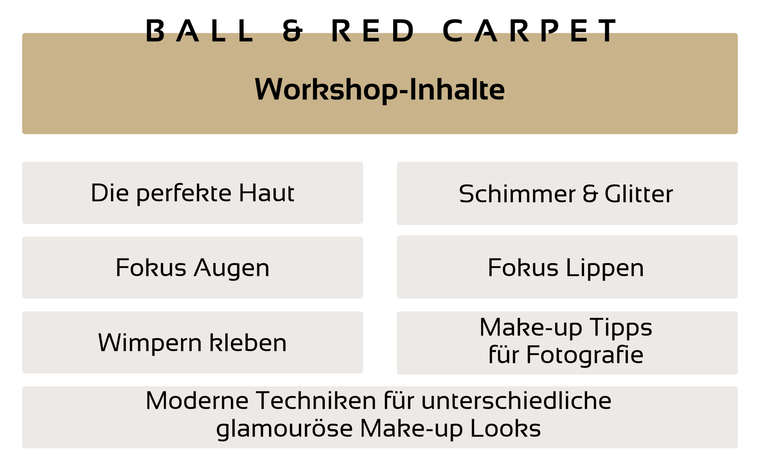Von eleganten Ball-Looks bis hin zu glamouröse Red-Carpet-Styles – in diesem Workshop zeigen wir dir wie du moderne Event-Make-ups umsetzen kannst, die langlebig sind und sowohl im sanften Licht der Ballsäle als auch im Blitzlichtgewitter glänzen.